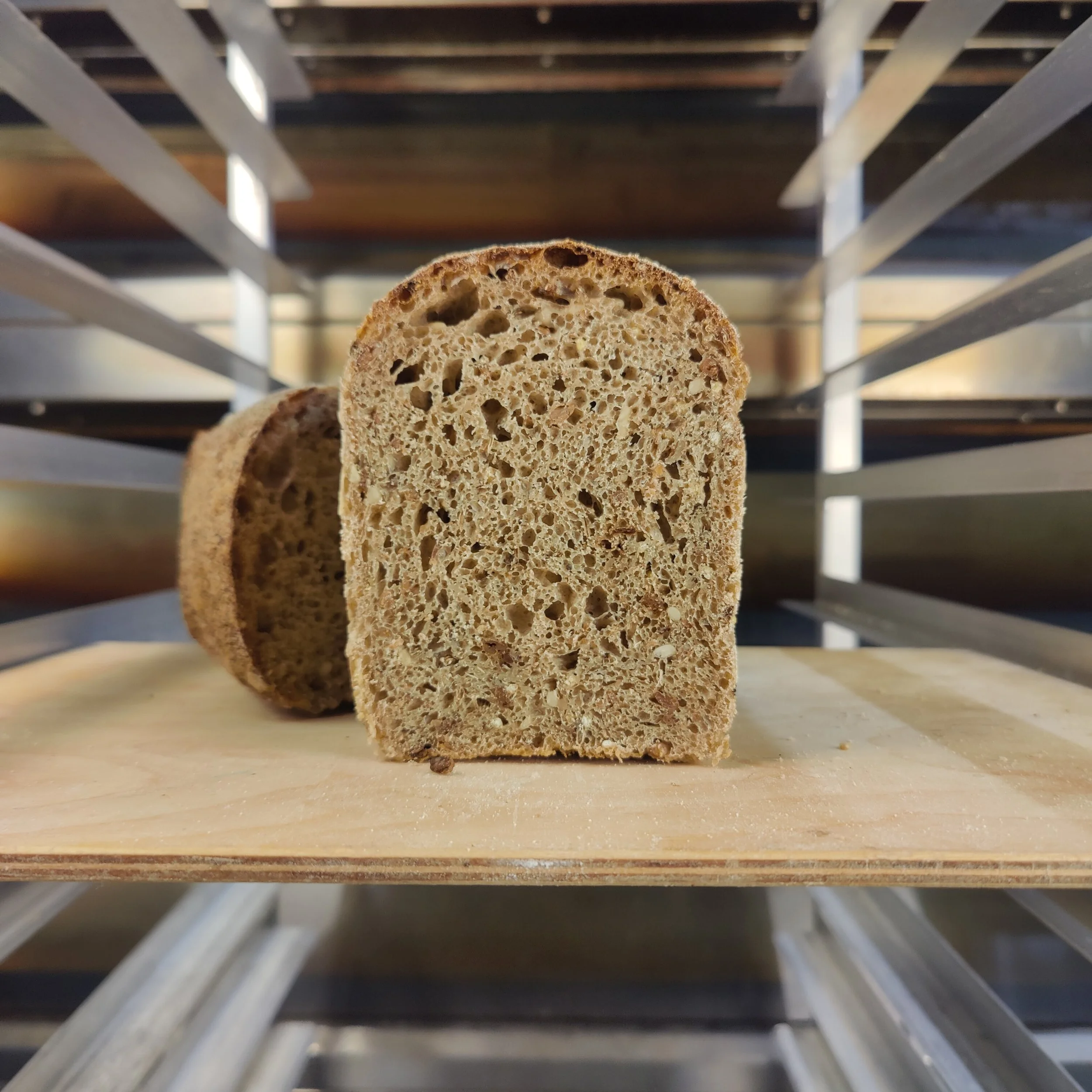 Our Seeded Tin Loaf is made with Lapwings Mill flour grown and milled at Newton Dee, less than 30 miles from our bakery. The recipe originates with our baker Dougal Stonebridge, and is fermented slowly from our organic sourdough starter for over 18 hours. It contains a mixture of flavourful grains and seeds, and is the ideal morning toasting bread, designed to accompany marmalade, soup and tangy cheeses.